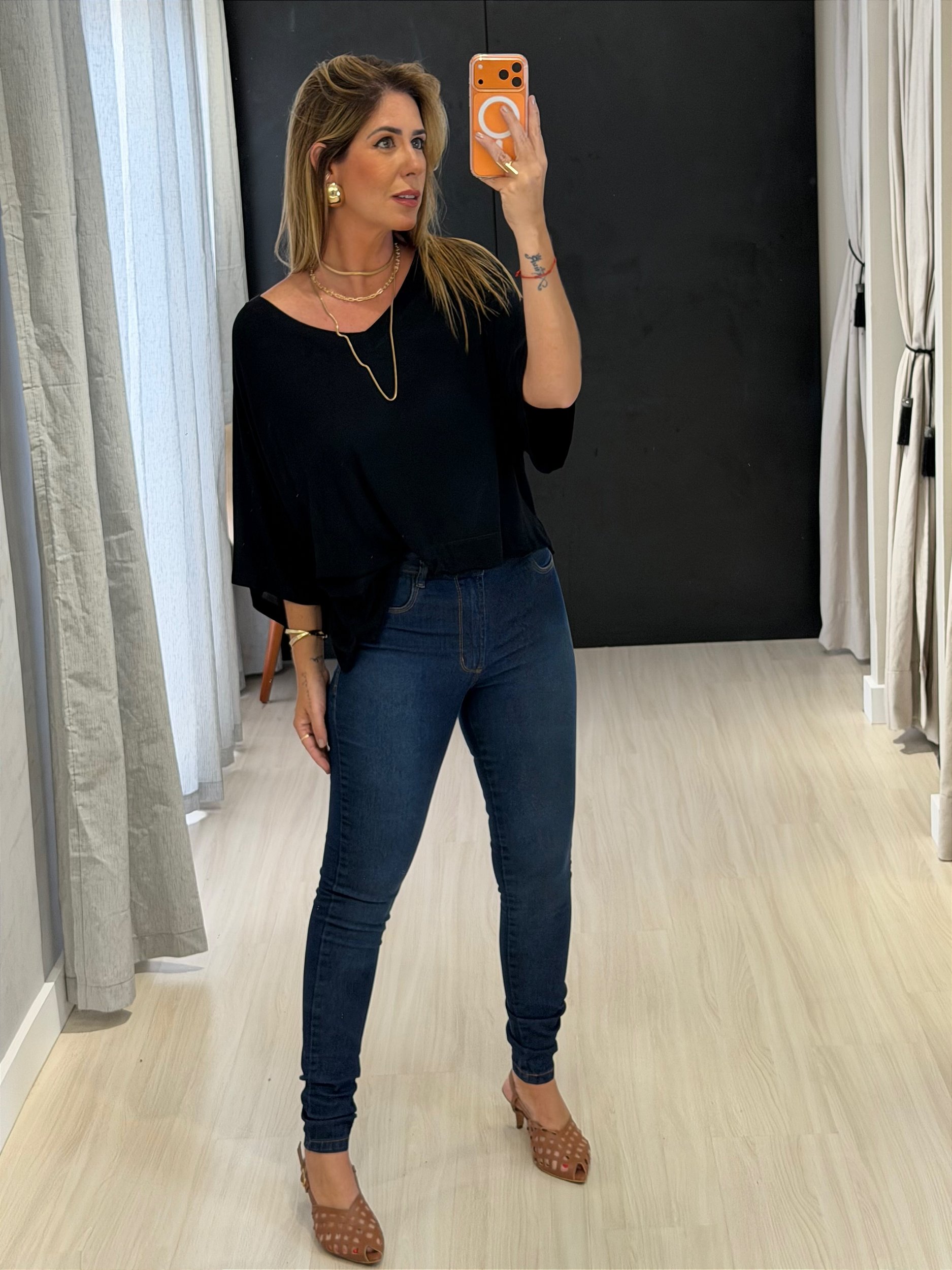 A Blusa Lívia é aquela peça indispensável no guarda-roupa! Com modelagem ampla e soltinha, ela oferece caimento leve e super confortável, perfeita para quem busca estilo sem abrir mão do bem-estar no dia a dia. Confeccionada em malha viscolycra, proporciona toque macio, ótima elasticidade e frescor, se ajustando ao corpo com suavidade. A gola V valoriza o colo de forma delicada, enquanto as mangas amplas trazem charme e movimento ao visual. Versátil e fácil de combinar, a Blusa Lívia vai do look casual ao mais elegante com apenas alguns acessórios. Uma peça prática, moderna e atemporal para todas as ocasiões!