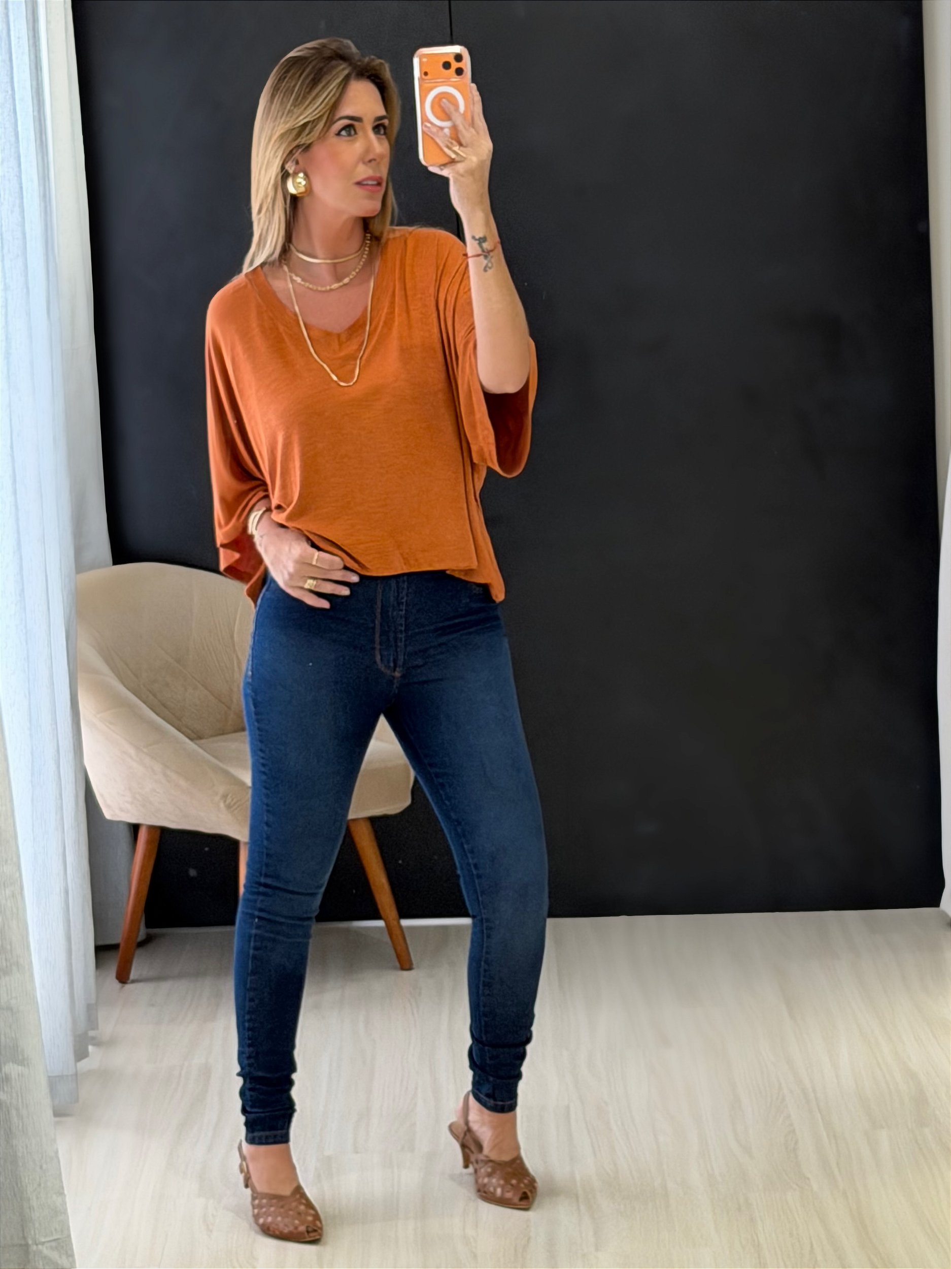 A Blusa Lívia é aquela peça indispensável no guarda-roupa! Com modelagem ampla e soltinha, ela oferece caimento leve e super confortável, perfeita para quem busca estilo sem abrir mão do bem-estar no dia a dia. Confeccionada em malha viscolycra, proporciona toque macio, ótima elasticidade e frescor, se ajustando ao corpo com suavidade. A gola V valoriza o colo de forma delicada, enquanto as mangas amplas trazem charme e movimento ao visual. Versátil e fácil de combinar, a Blusa Lívia vai do look casual ao mais elegante com apenas alguns acessórios. Uma peça prática, moderna e atemporal para todas as ocasiões!