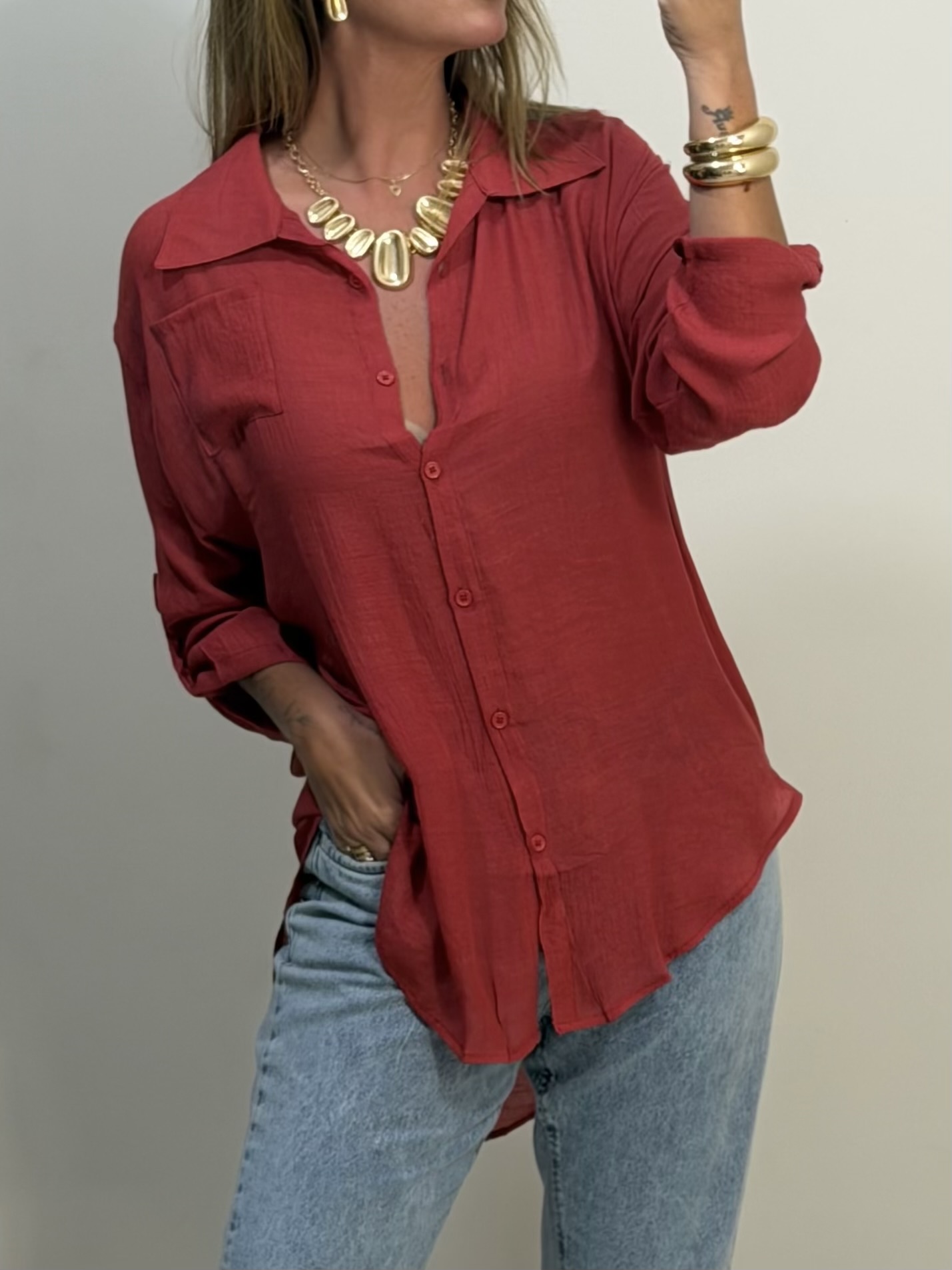 Versátil, moderna e indispensável no guarda-roupa! Nossa maxi camisa é aquela peça curinga que transforma qualquer look com praticidade e estilo. Com manga longa ajustável, ela possui botão que permite usar as mangas mais curtas, trazendo duas propostas em uma só peça. O fechamento frontal em botões garante um visual clássico e atemporal, enquanto o bolso frontal único adiciona um toque despojado e atual.