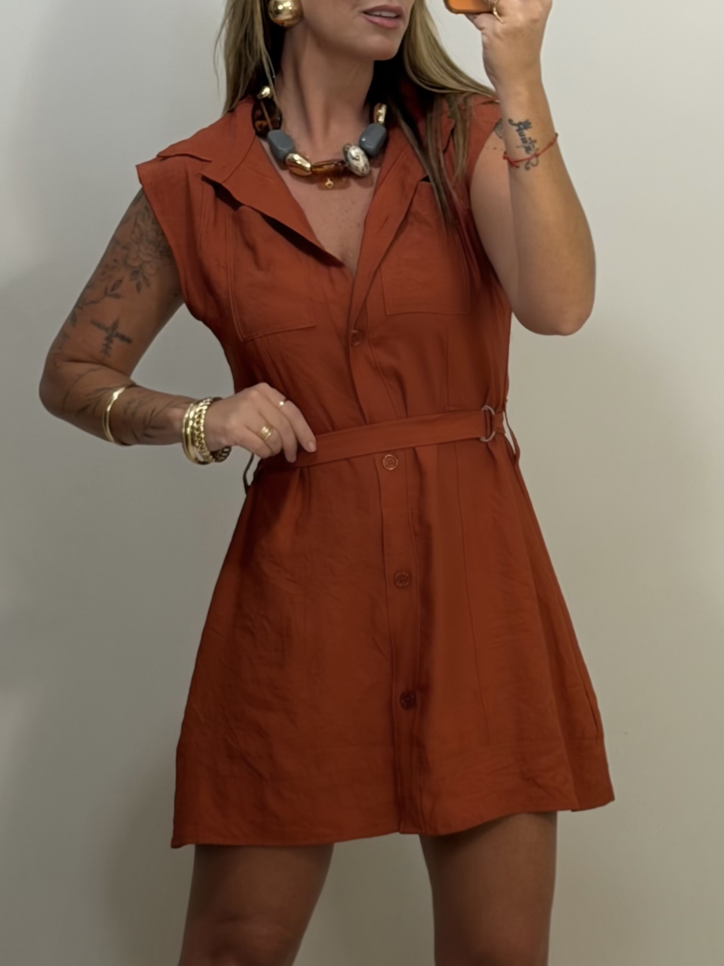 Chemise curta confeccionada em tecido leve e confortável, perfeita para compor looks versáteis e elegantes. Possui fechamento frontal por botões, bolsos frontais que agregam praticidade e estilo, além de passadores que acompanham cinto faixa no mesmo tecido, valorizando a silhueta com um ajuste delicado na cintura. Ideal para diversas ocasiões, do casual ao sofisticado, é uma peça curinga que une charme e funcionalidade.