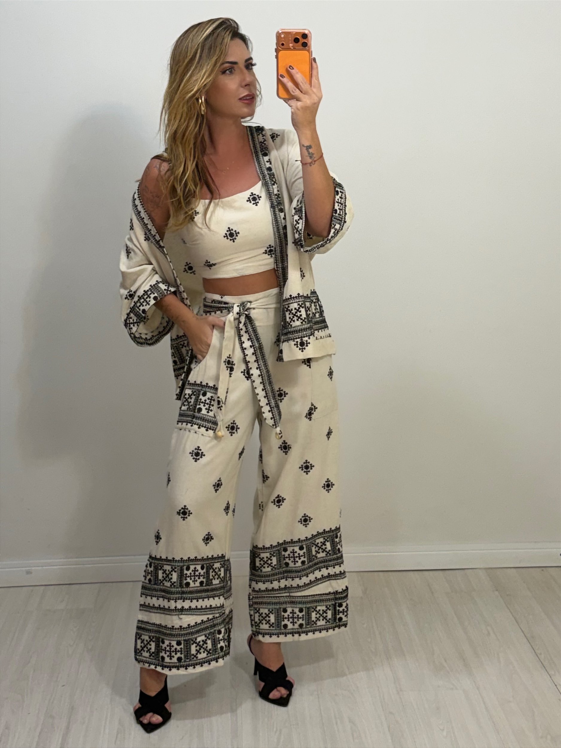 Elegância e leveza definem este conjunto em linho totalmente bordado, perfeito para quem ama peças marcantes e cheias de estilo. Composto por kimono de mangas amplas, que traz movimento e sofisticação ao look, cropped reto com alças reguláveis que garantem um ajuste perfeito, e calça pantalona que alonga a silhueta com muito charme. A calça conta com elástico na parte de trás da cintura para mais conforto, além de amarração frontal que valoriza o visual e bolsos laterais que unem praticidade ao design.