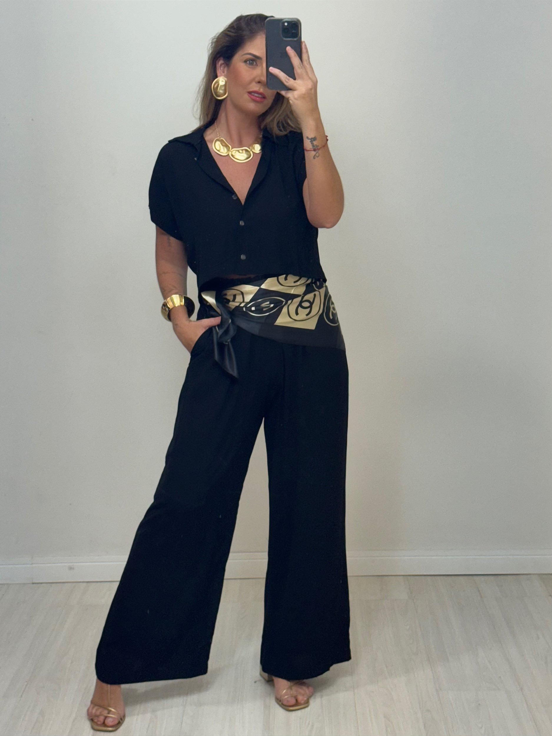 Perfeito para quem ama se vestir bem sem abrir mão do conforto, esse conjunto em viscolinho é a escolha ideal para composições modernas e versáteis. A blusa de manga curta com fechamento em botões traz um toque clássico e elegante, enquanto a calça pantalona com elástico na cintura, detalhe de amarração e bolsos laterais garante um caimento leve e cheio de personalidade. Possui forro. Use junto ou separado e arrase em qualquer ocasião!