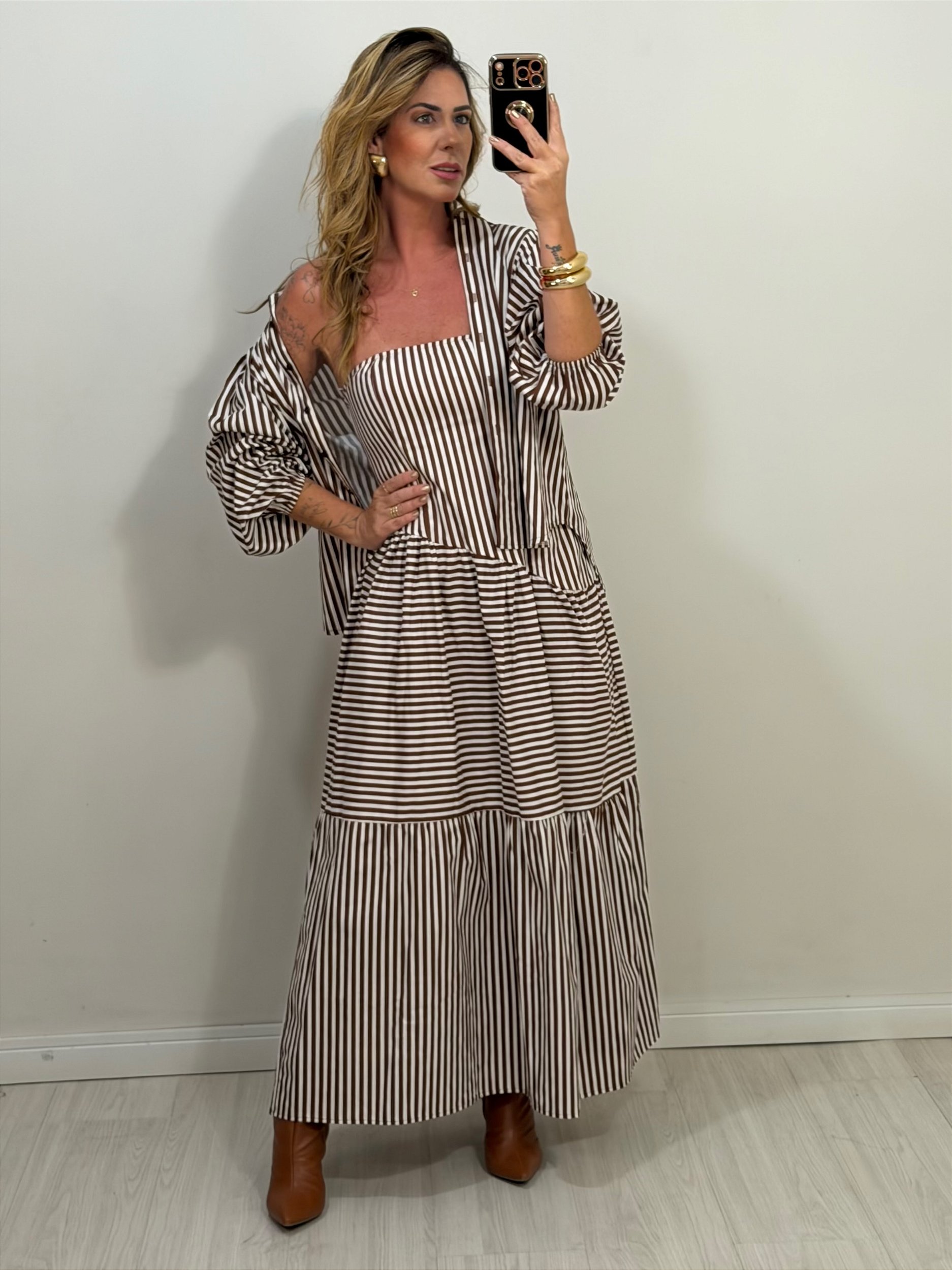Conjunto listrado em viscose pré lavada que une leveza, estilo e sofisticação em uma proposta moderna. Composto por vestido longo tomara que caia, o modelo possui elástico na parte superior e lastex nas costas, garantindo ajuste confortável e perfeito ao corpo. O recorte assimétrico traz um toque contemporâneo, enquanto a modelagem levemente evasê proporciona fluidez e movimento à peça. Acompanha camisa com fechamento em botões e elástico nos punhos, ideal para sobreposição e versatilidade no look. Um conjunto elegante e descomplicado, perfeito para diversas ocasiões.