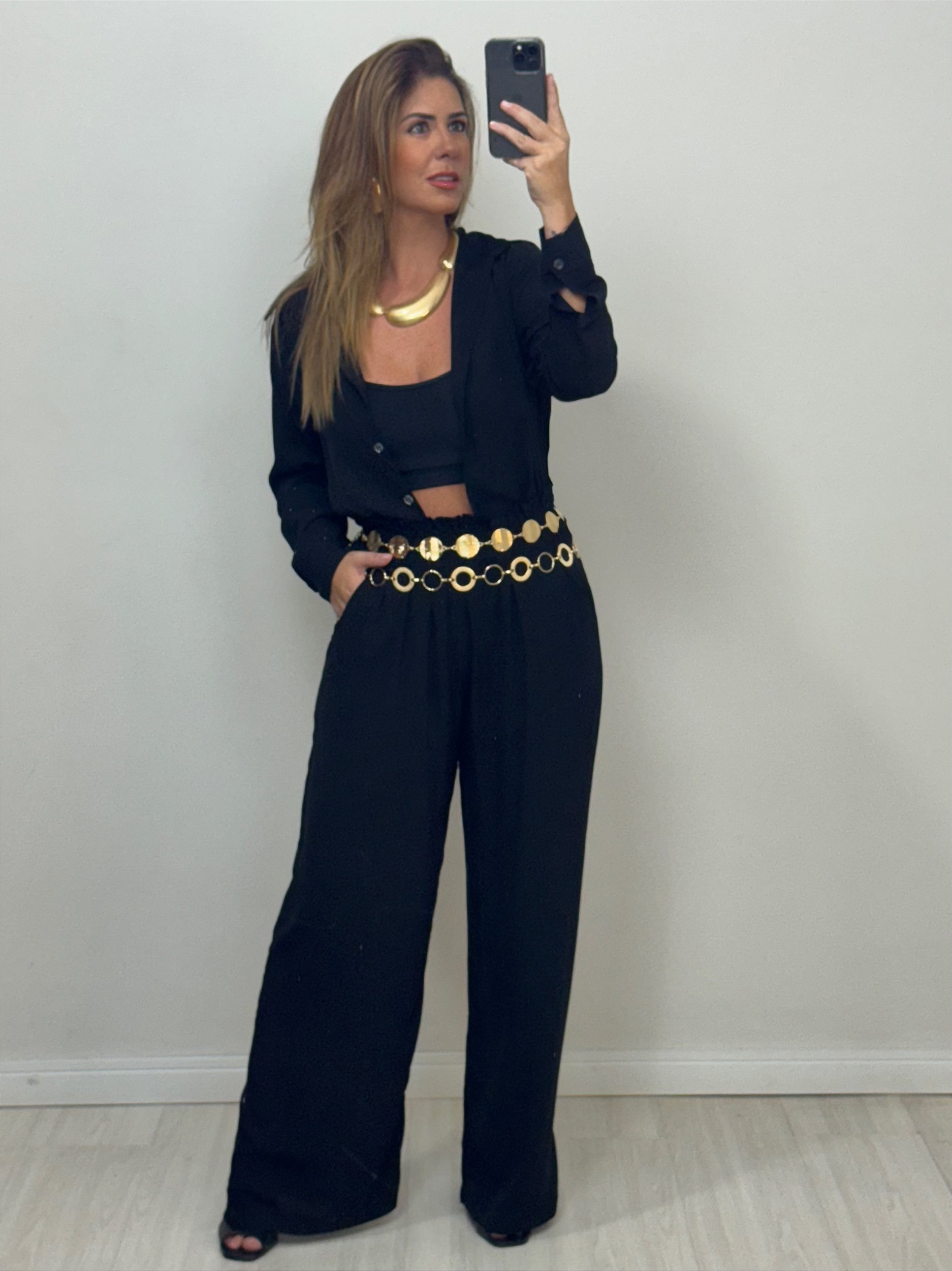 Perfeito para quem ama se vestir bem sem abrir mão do conforto, esse conjunto em viscolinho é a escolha ideal para composições modernas e versáteis. A camisa de manga longa com fechamento em botões traz um toque clássico e elegante, enquanto a calça pantalona com elástico na cintura, detalhe de amarração e bolsos laterais garante um caimento leve e cheio de personalidade. Possui forro. Use junto ou separado e arrase em qualquer ocasião!