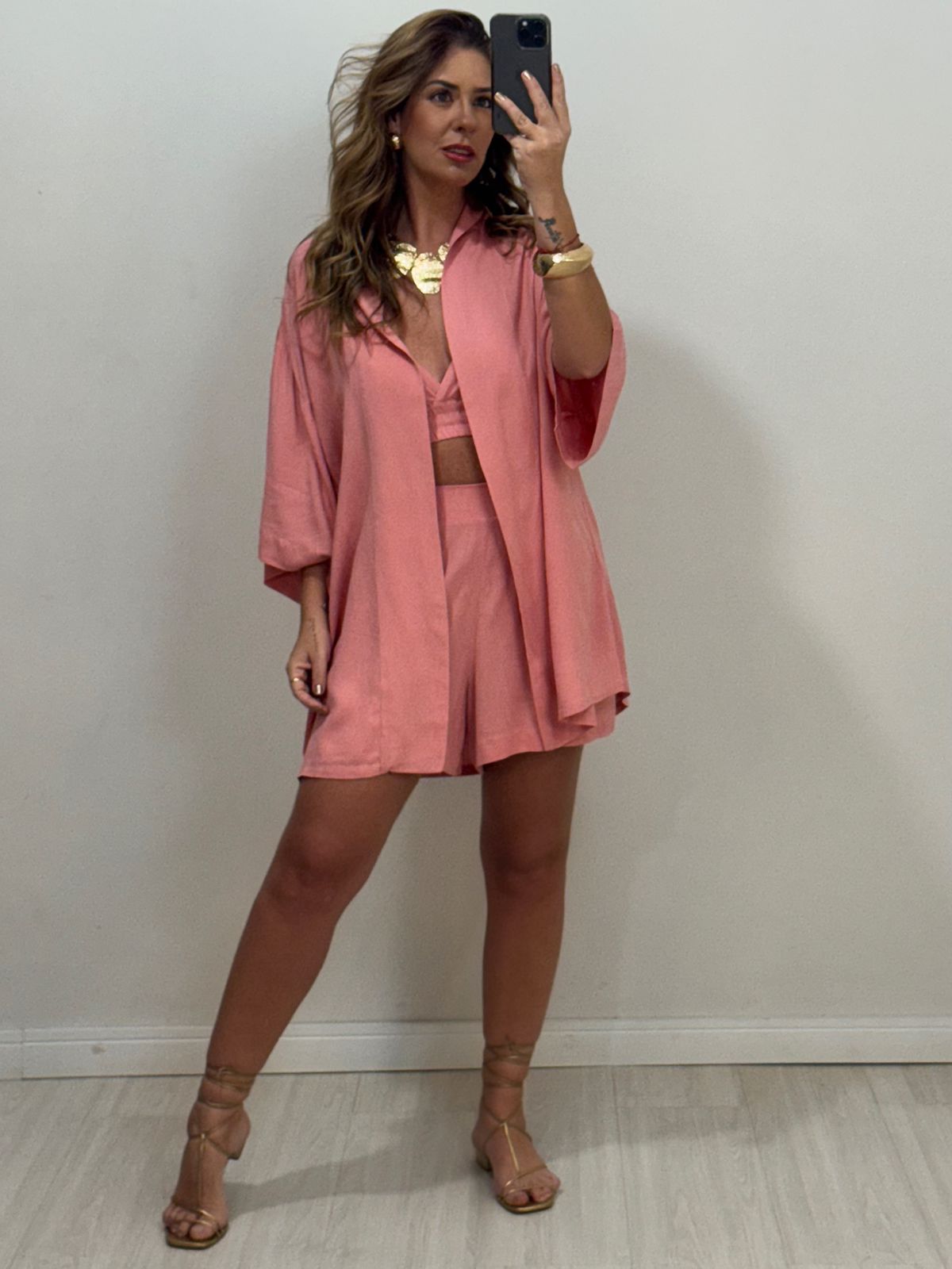 O Conjunto Mel em viscose é perfeito para quem busca leveza, estilo e conforto. Ele é composto por um top com alças reguláveis, decote V e elástico na parte de trás, proporcionando ajuste ideal e caimento impecável. Acompanha um kimono de manga curta com modelagem soltinha, que adiciona charme e fluidez ao look. O short possui cintura com elástico e bolsos laterais, oferecendo praticidade e bem-estar para o dia a dia. Versátil e moderno, o Conjunto Mel é a escolha ideal para composições frescas e cheias de personalidade.