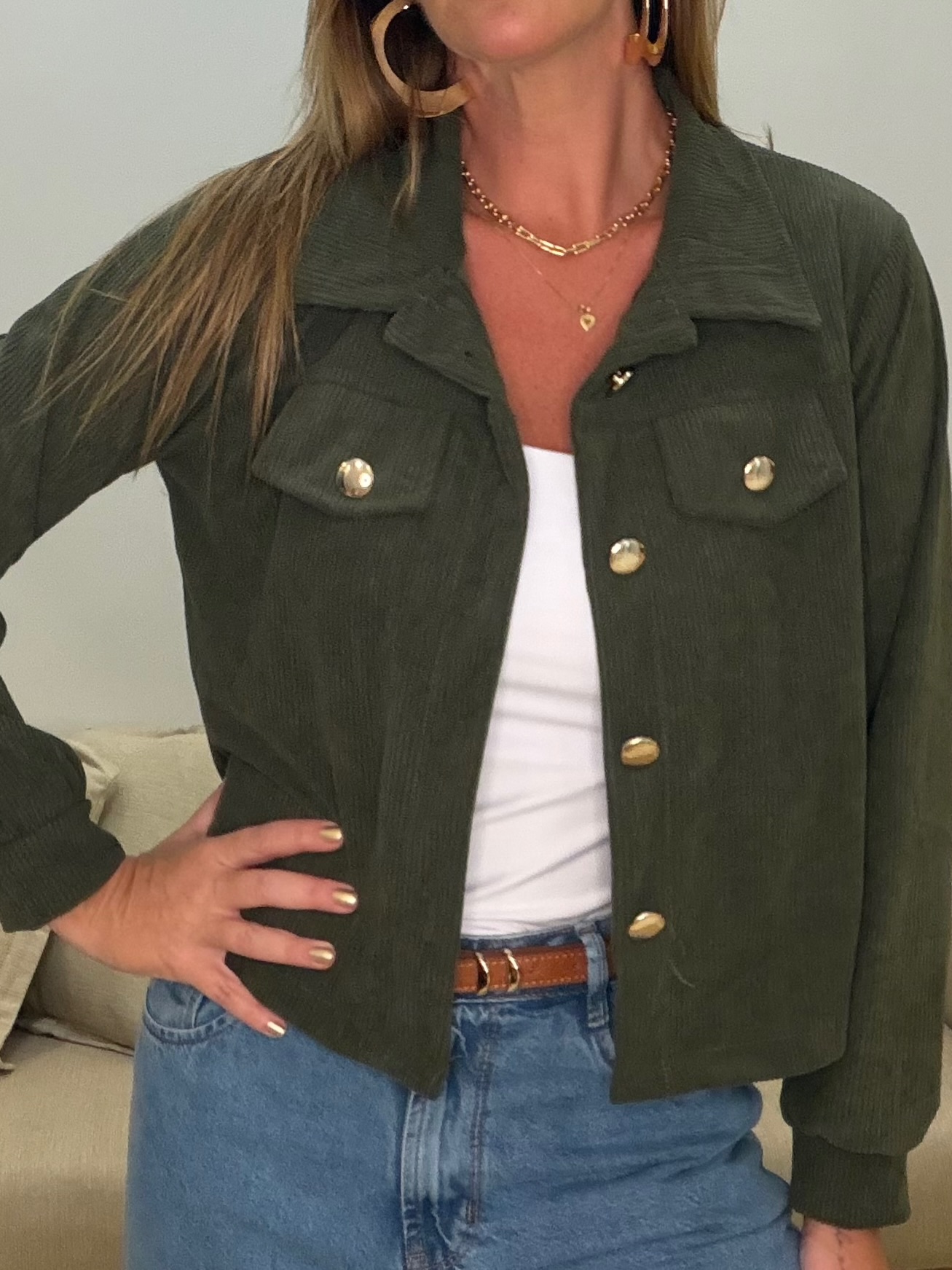 Com um toque retrô e cheio de sofisticação, esta jaqueta em veludo cotelê é perfeita para compor looks estilosos e modernos. Confeccionada com um tecido encorpado e macio, ela apresenta fechamento frontal por botões, bolsos falsos decorativos que dão charme à peça e punhos com fechamento em botão, que garantem um acabamento refinado. Versátil e atemporal, é ideal para compor produções casuais ou mais elegantes com facilidade.