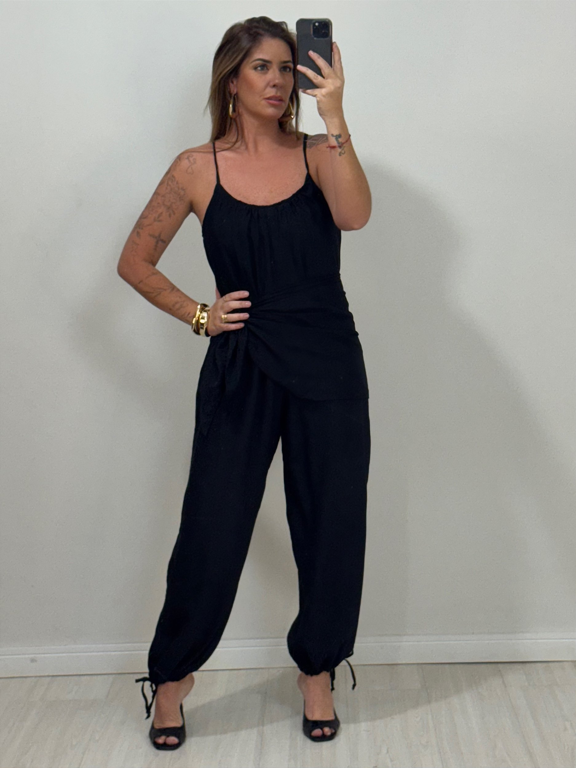 Com bolsos laterais que trazem funcionalidade e uma amarração na barra estilo Aladim, o macacão garante ajuste perfeito e um toque moderno ao visual. Acompanha faixa pareô, permitindo composições ainda mais elegantes e personalizadas.
