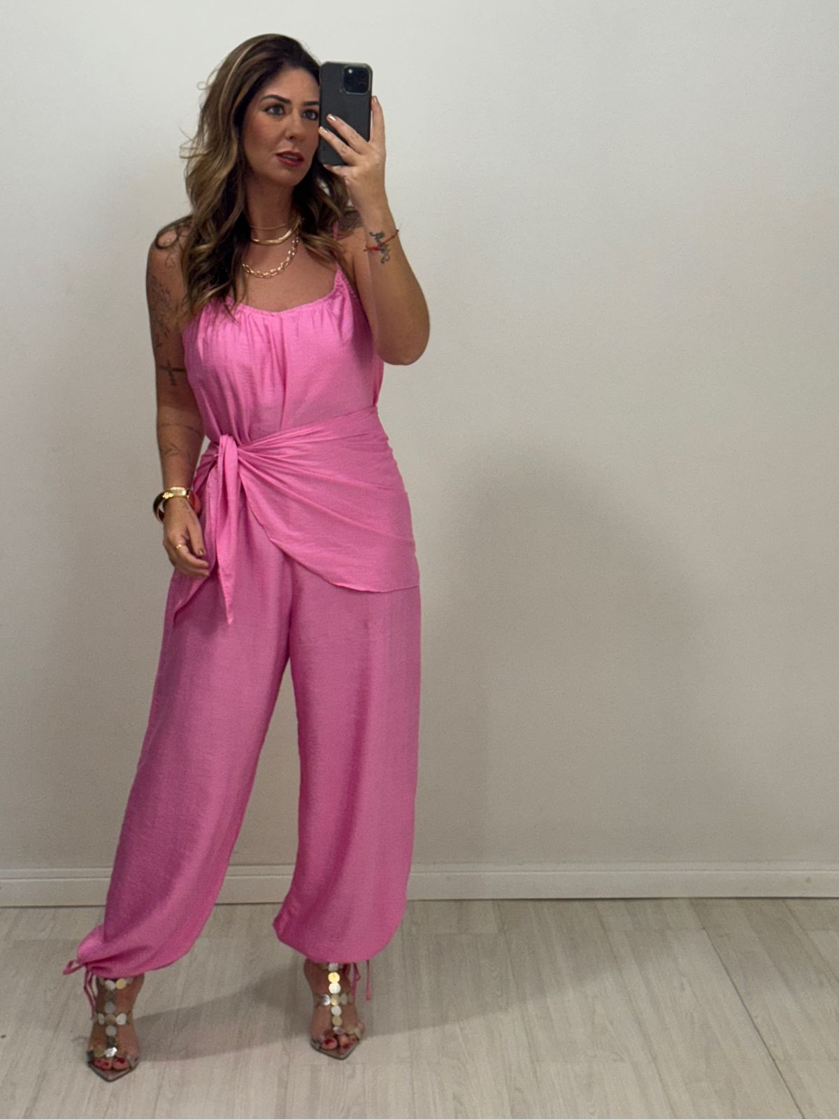 Com bolsos laterais que trazem funcionalidade e uma amarração na barra estilo Aladim, o macacão garante ajuste perfeito e um toque moderno ao visual. Acompanha faixa pareô, permitindo composições ainda mais elegantes e personalizadas.