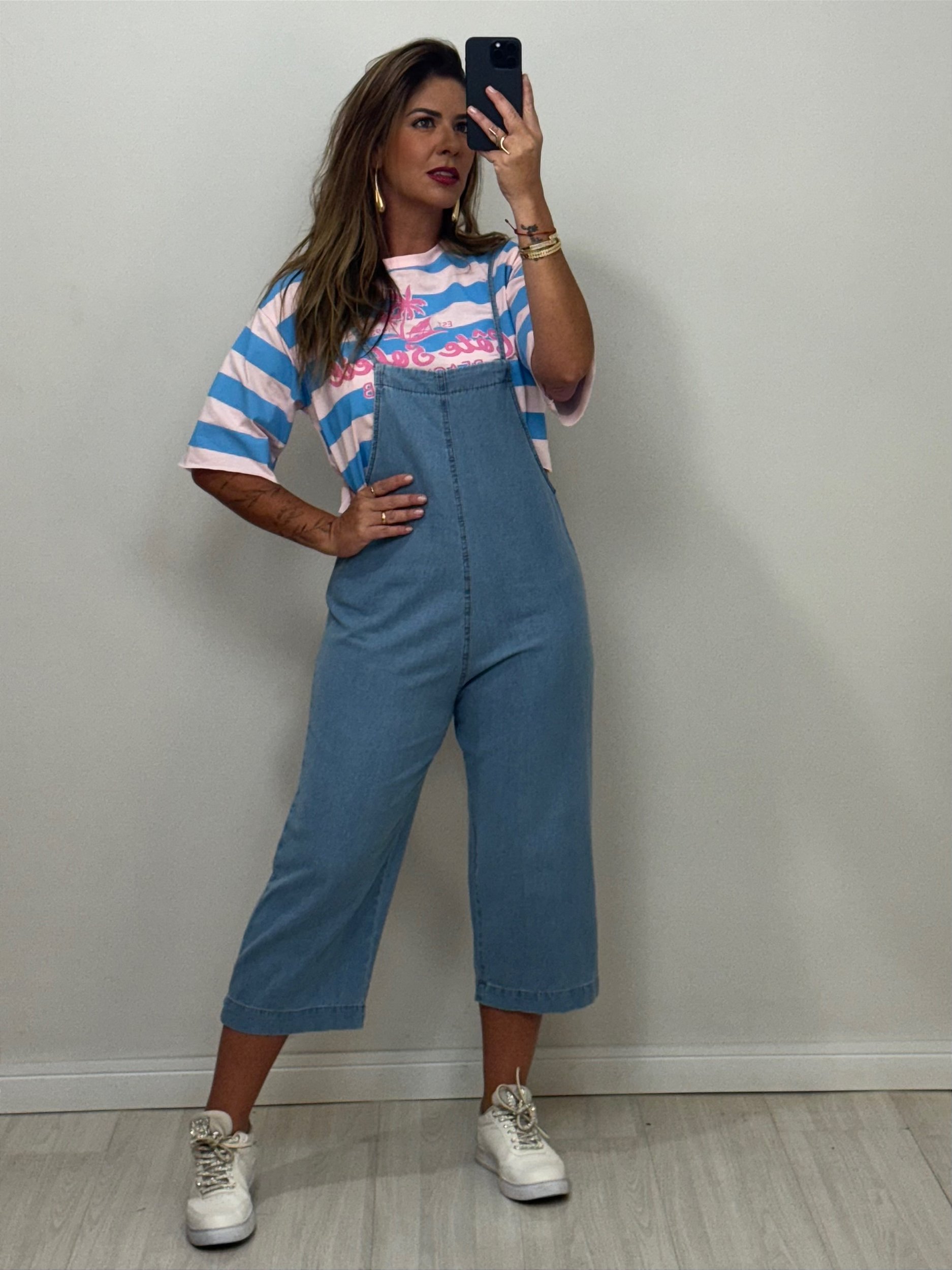 A queridinha do guarda-roupa voltou com tudo! Nossa salopete jeans une praticidade, estilo e aquele toque retrô que nunca sai de moda. Feita em jeans de alta qualidade, ela possui alças reguláveis, que garantem um ajuste perfeito e mais conforto no dia a dia. Super versátil, combina com blusas, camisetas, croppeds e tênis ou botas – perfeita para todas as estações!