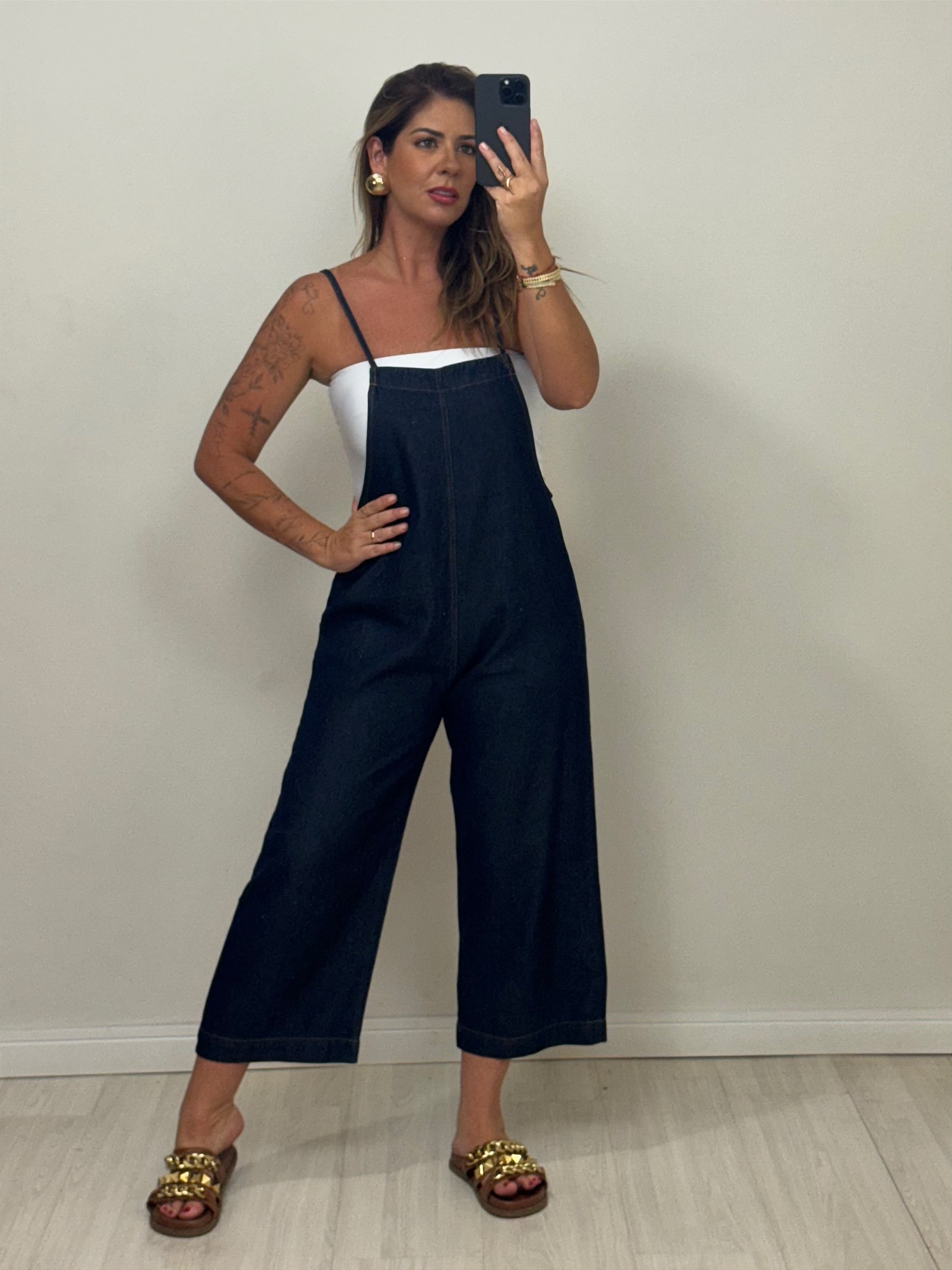 A queridinha do guarda-roupa voltou com tudo! Nossa salopete jeans une praticidade, estilo e aquele toque retrô que nunca sai de moda. Feita em jeans de alta qualidade, ela possui alças reguláveis, que garantem um ajuste perfeito e mais conforto no dia a dia. Super versátil, combina com blusas, camisetas, croppeds e tênis ou botas – perfeita para todas as estações!
