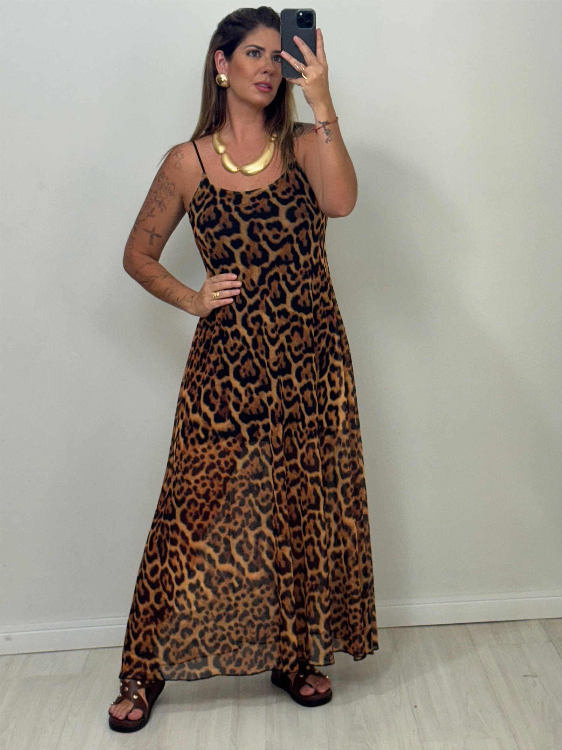 Perfeito para quem ama um visual leve e cheio de personalidade, este vestido é a combinação ideal de conforto e sofisticação. Com alças finas delicadas, caimento amplo que valoriza todos os tipos de corpo e forro macio que garante liberdade de movimento, ele transforma cada passo em um verdadeiro desfile de elegância. Um toque selvagem e sofisticado para qualquer ocasião!