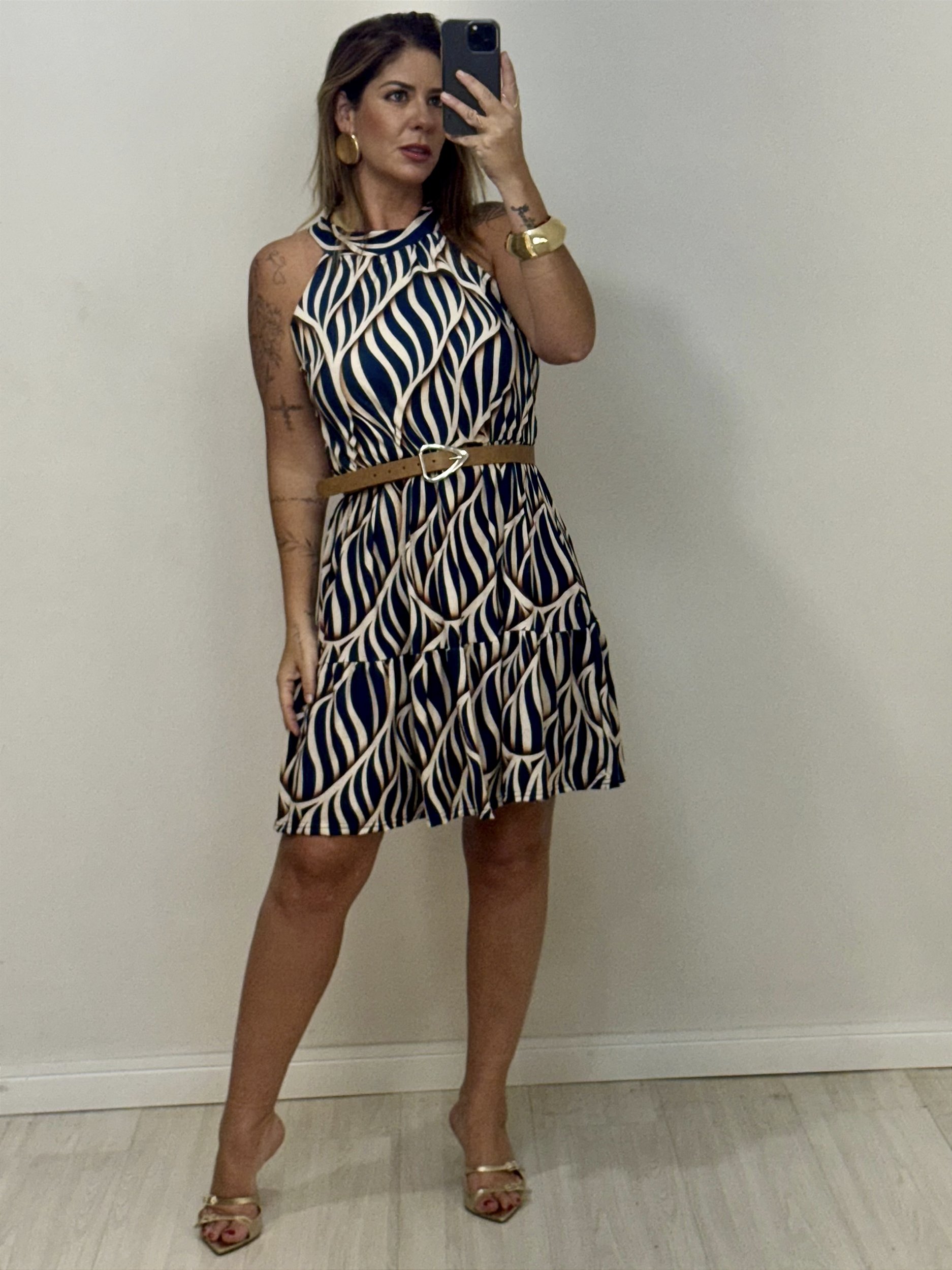 Com cava entrada e elástico na cintura, o modelo oferece um caimento natural e confortável. O cinto faixa no mesmo tecido realça a feminilidade e permite ajustar conforme o gosto, enquanto a am amarração nas costas adiciona um toque delicado e moderno ao visual.