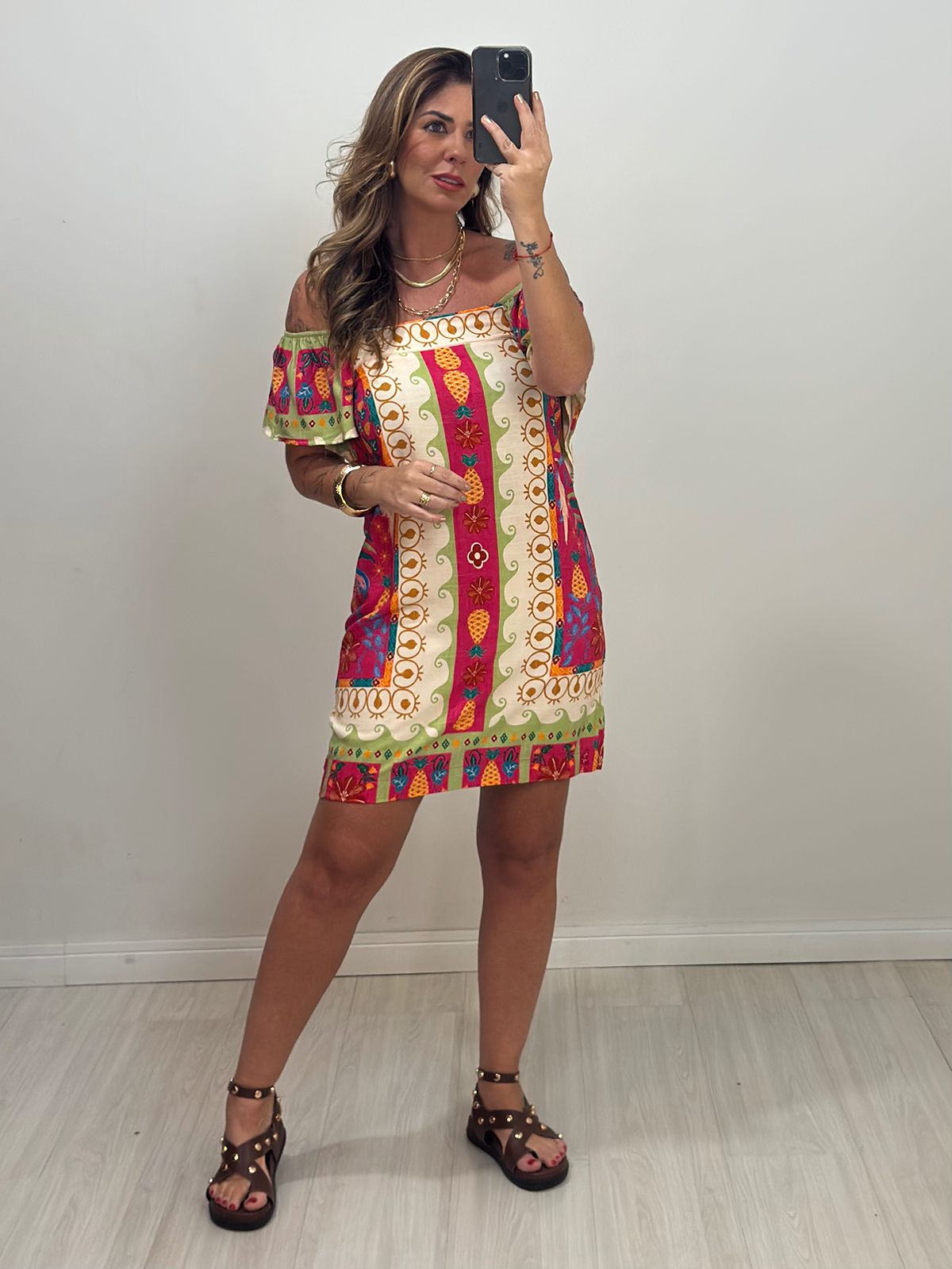 O Vestido Dara é aquele modelo perfeito para iluminar o look com charme e personalidade. Com estampa vibrante e cheia de detalhes coloridos, ele traz um visual alegre e estiloso. Sua modelagem soltinha oferece conforto e leveza, enquanto o decote ombro a ombro valoriza o colo e adiciona um toque feminino e moderno. De comprimento curto, o Dara é ideal para dias quentes, passeios e produções descontraídas. Um vestido versátil, confortável e marcante — perfeito para quem ama se vestir com cor e estilo.