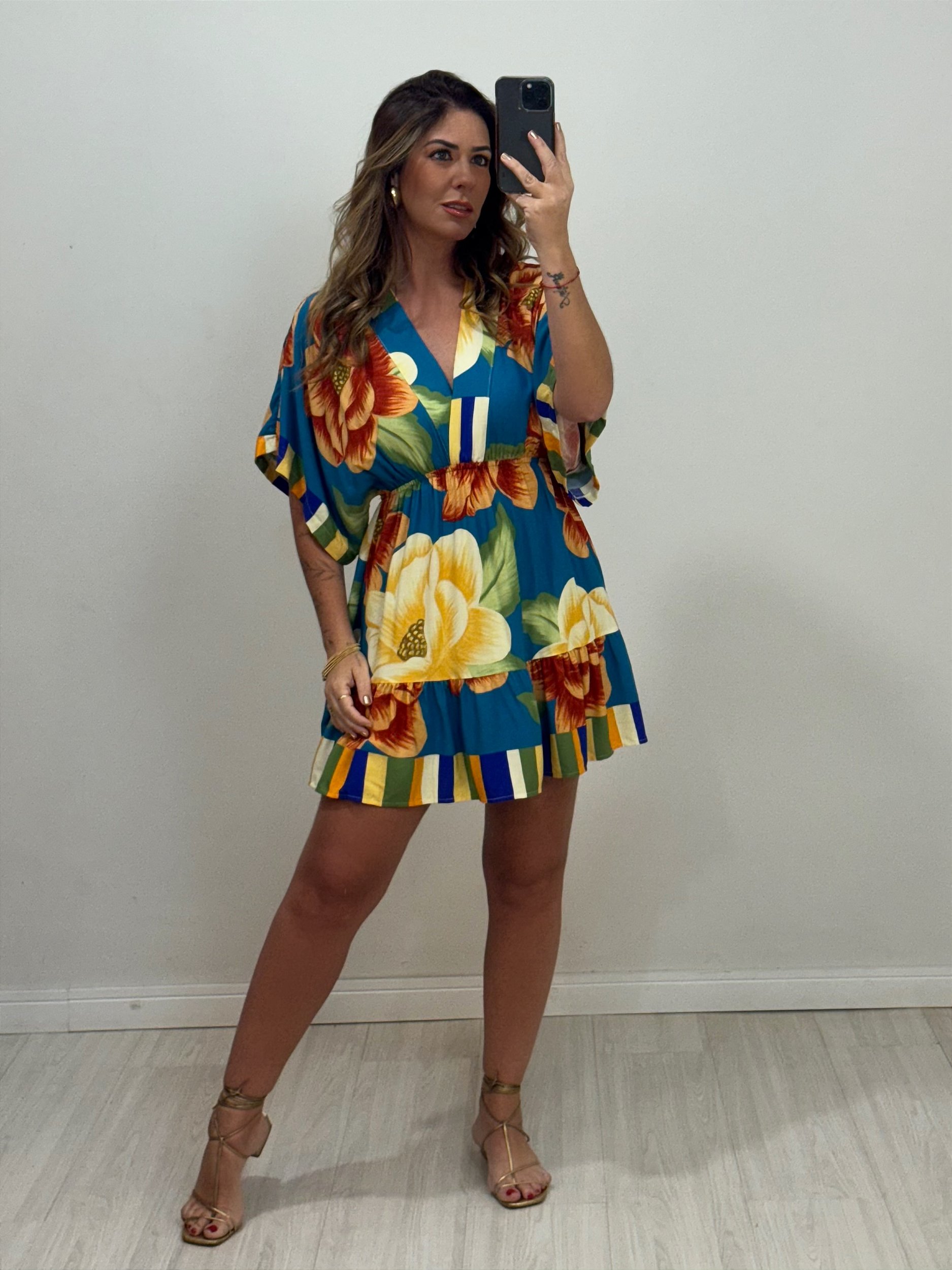 Vestido curto, com manga morcego que confere movimento e sofisticação, elástico na cintura que valoriza a silhueta de forma delicada, decote transpassado que realça o colo com charme e feminilidade. O tecido leve proporciona conforto e um caimento fluido, tornando a peça ideal para eventos, encontros ou ocasiões especiais.