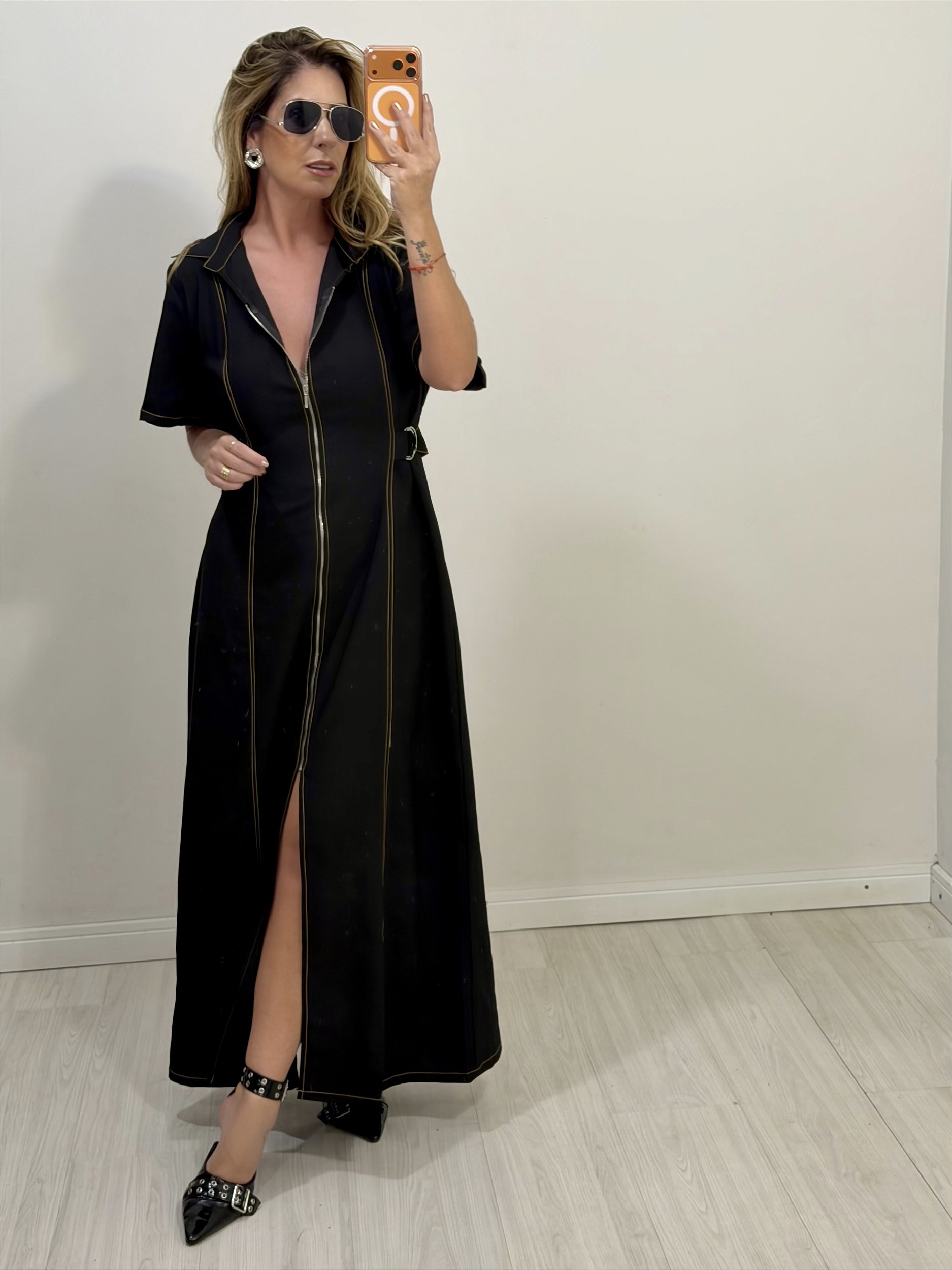 Elegante e versátil, o Vestido Lya é a escolha perfeita para quem busca estilo e conforto em uma única peça. Confeccionado em tecido mais encorpado de viscose com tencel, proporciona um caimento estruturado e sofisticado. O modelo longo possui gola clássica e fechamento frontal em zíper, que traz modernidade e praticidade ao vestir. As costuras em pesponto na cor caramelo destacam o design da peça, criando um contraste elegante. O vestido conta ainda com passadores em metal prata e cinto faixa, permitindo ajustar a silhueta com charme. Para maior conforto, a cintura possui elástico na parte traseira, garantindo melhor ajuste ao corpo sem perder a elegância. Uma peça atemporal, ideal para compor produções sofisticadas tanto para o dia quanto para a noite.