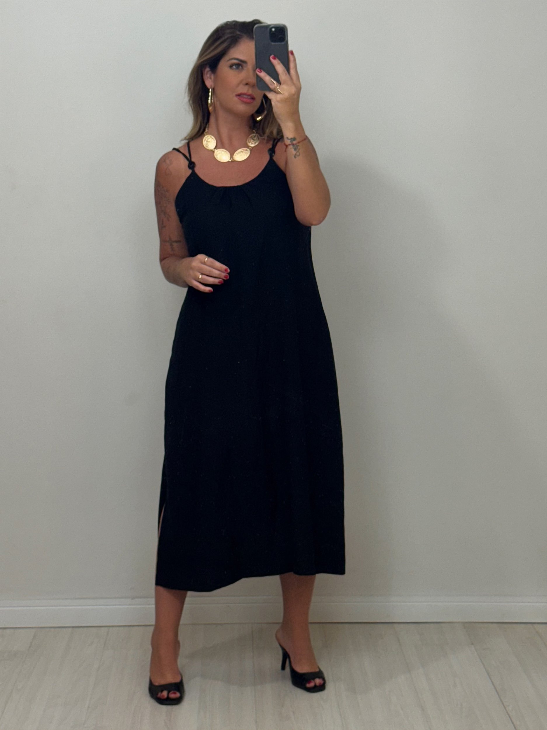 Com alças finas e detalhe em argola, o modelo traz um toque moderno e sofisticado. O decote redondo confere um ar delicado, enquanto as fendas laterais adicionam charme e movimento à peça.