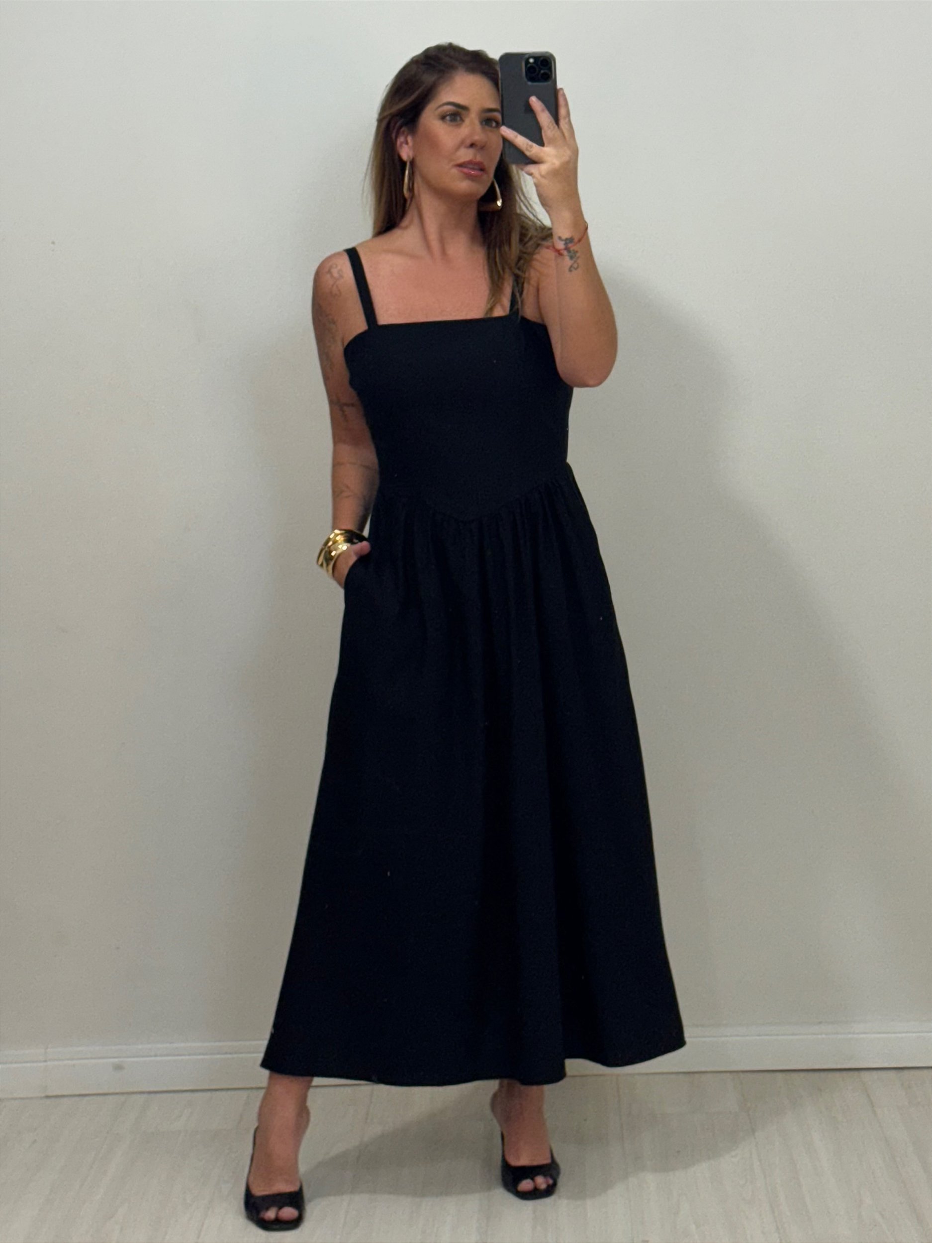 O caimento perfeito existe. Modelo com alças reguláveis, corpo ajustado estilo corset que realça a silhueta e saia levemente volumosa com bolsos. Fechamento em zíper nas costas para mais segurança e elegância. Aposte!